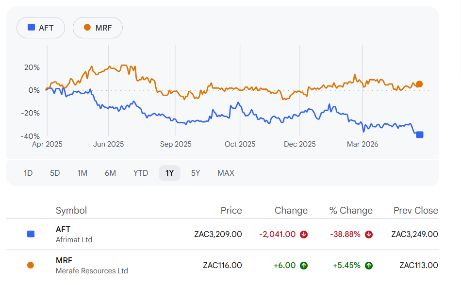 The share price is actually 5.5% up over 12 months, with the market believing that a resolution to the smelter crisis is just around the corner. Although Afrimat has broader issues, it’s still amazing to me that Merafe’s share price has been so resilient vs. Afrimat’s nasty drop: