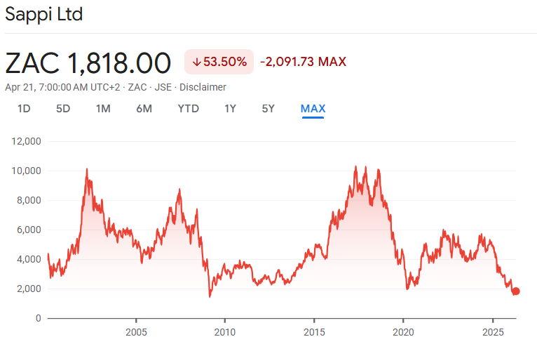 In the meantime, the share price remains in the doldrums. This is a nasty part of the cycle for Sappi. Those with (very) patient capital and a strong stomach may find this chart interesting: