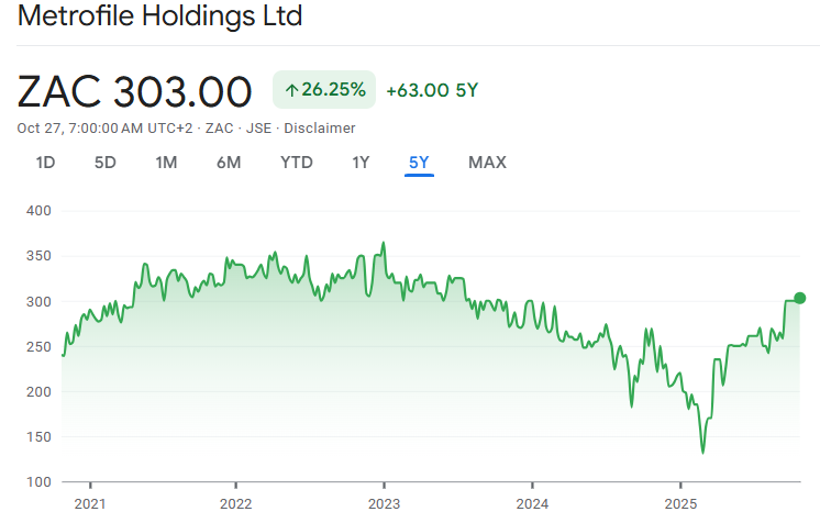 For Metrofile shareholders, it’s much simpler than that: the scheme is a way to sell their shares at a premium of 95% to the 30-day VWAP up to 25 March, the day prior to the release of the cautionary. Before you get too excited about that premium, you need to see a multi-year chart of the share price: