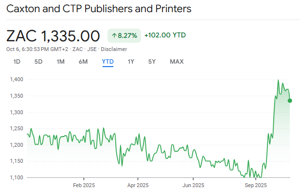 Jokes aside, there have been some notable moves among mid-caps on the JSE as well. The market responded positively to STADIO’s strong results, but that was nothing compared to the rally enjoyed by Caxton and CTP Publishers and Printers in recent weeks: